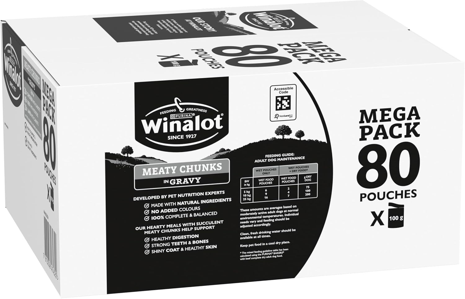 WINALOT Meaty Chunks Adult Wet Dog Food Mixed in Gravy Beef, Chicken, Lamb 80x100g Pouches